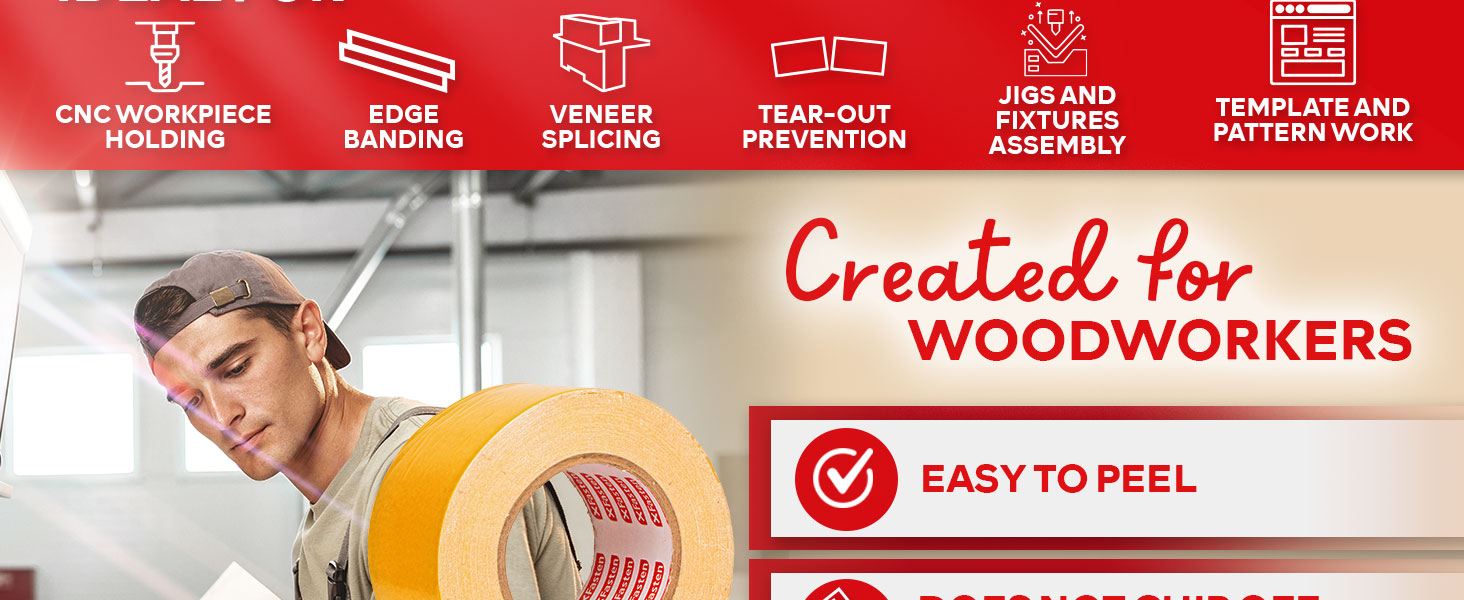 Made by Woodworkers: Collaborating with woodworker communities, we engineered blended silicone with the right adhesive thickness making our 2 sided tape ideal for MDF, plywood, veneer—industrial hold during routing yet removes without fiber damage.
