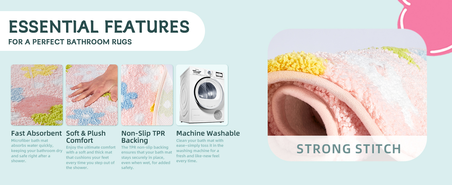 Highly Absorbent: Designed to quickly absorb moisture, this rug helps keep your bathroom floors dry and clean, preventing slips and puddles after a shower or bath.
