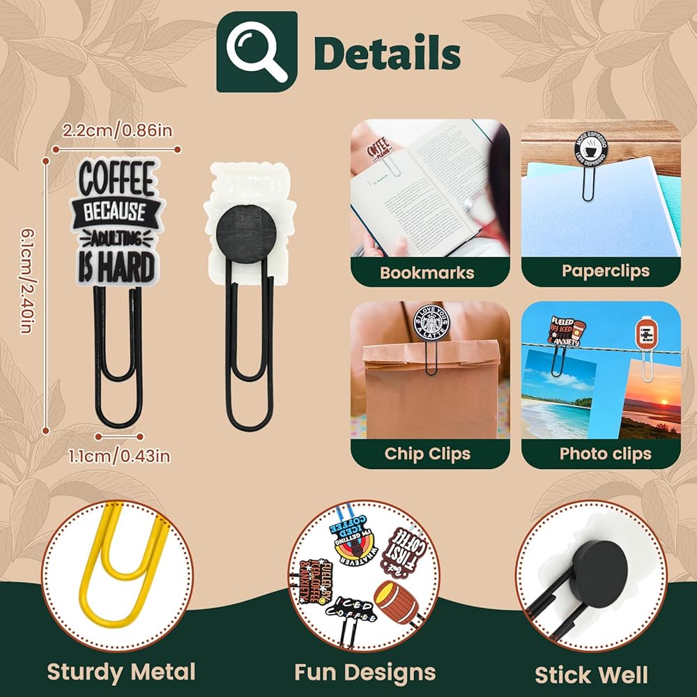 Package include:You will get 30pcs Coffee Paperclip Bookmark in Large Size.No Repeats.A wide variety of designs can meet your replacement needs and share with friends, family, colleagues, or your partner who also love coffee