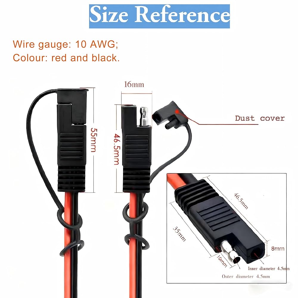 Compatible with most SAE interfaces, widely used for various batteries, outdoor lighting, motorcycles, cars, motorhomes, boats, lawnmowers, tractors, trucks, solar panels, and other equipment requiring SAE plug power supply. Convenient and efficient. Ensure correct positive and negative polarity before connecting.