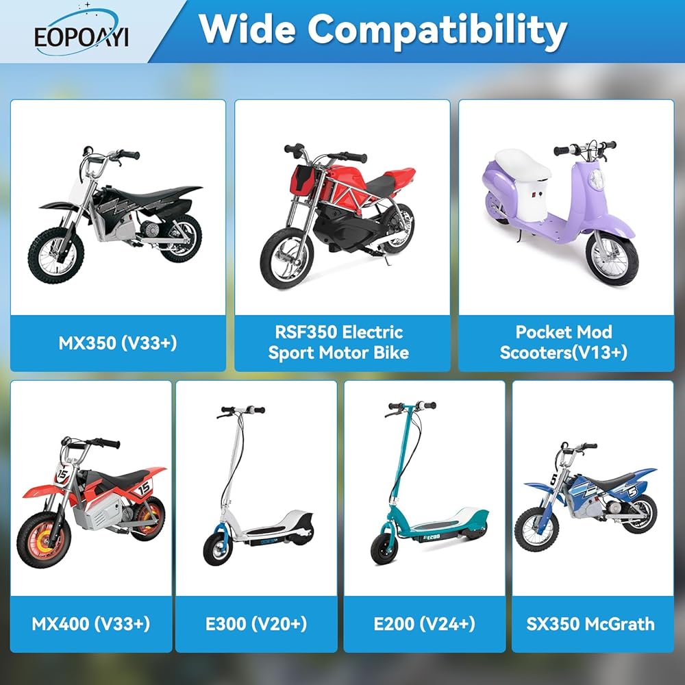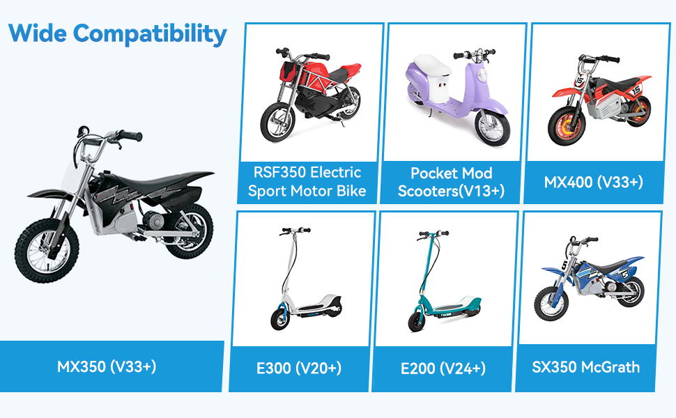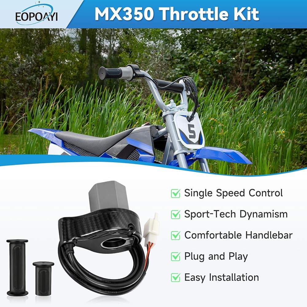 Fitment: The MX350 throttle is compatible with Razor MX350 Version 33+, MX400 Version 33+, SX350 McGrath Dirt Rocket Bike, RSF350 Electric Sport Motor Bike, E300 Version 20+, E200 Version 24+, E100 Version 10+ Electric Scooter, and Pocket Mod Scooters Version 13+ (Chrissy, Sweet Pea, Vapor, Bella, Betty, Blossom, Miniature Euro, Daisy, Kiki, Bellezza).Notice: the throttle is not universal, only designed for specific versions
