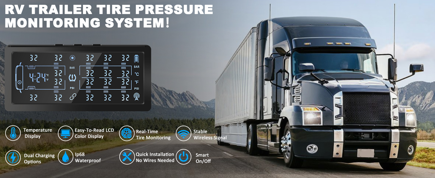 POWERFUL SIGNAL BOOSTER & LONG-DISTANCE SIGNAL TRANSMISSION: To increase the signal and overcome the challenges of distance and electromagnetic interference, our tire monitoring system add an additional signal booster. The signal of the TPMS may be unstable after the distance between the sensor and the monitor exceeds 8M, and the electronic equipment in the vehicle may also interfere with the signal. The signal booster can stabilize the signal within 36 feet. Our TPMS for RV has its own repeater to avoid the trouble of signal interruption. It is specially designed for travel trailers, motorhome and large vehicles