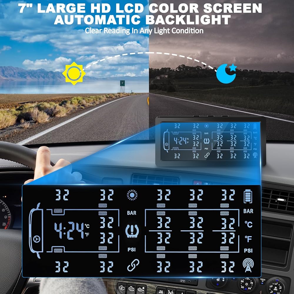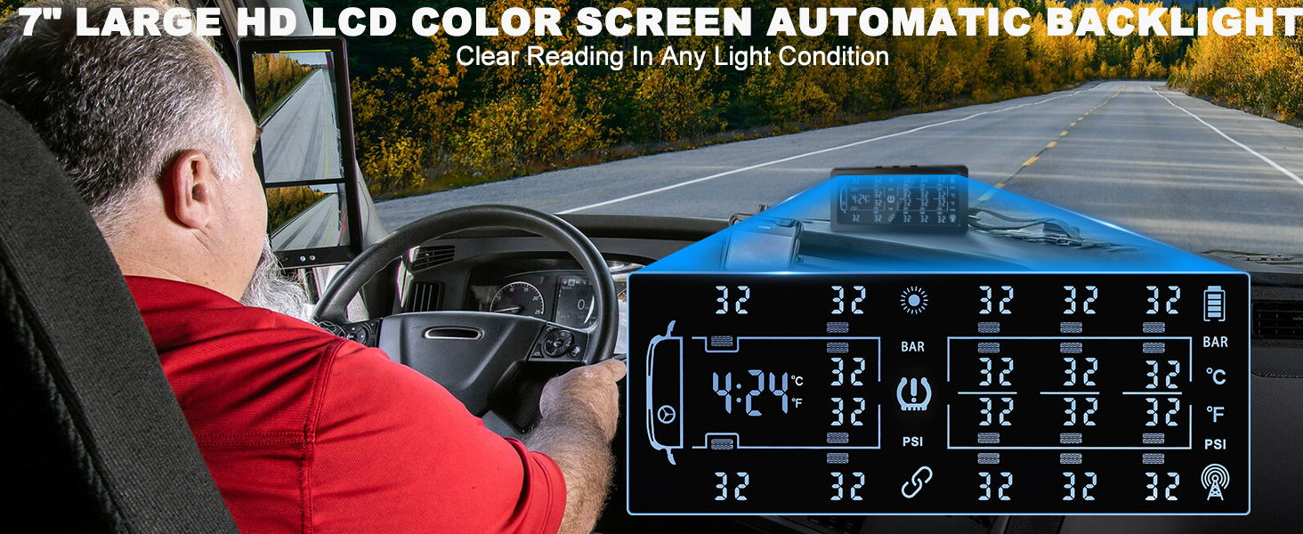 REAL TIME MONITORING & CAN MONITOR UP TO 8-18 TIRES : Our tire pressure monitoring system has a 7inch large screen for displaying up to 8 tires' data in one page, also the display will automatically switch between the in-car temperature, time, tire pressure, and tire temperature. You can view up to 18 tires without press a button. The TPMS handles pressure up to 188 psi and tire temperature up to 185 ℉, specially designed for large vehicle.The tire pressure sensor updates data every 0.3 seconds, and the display screen refreshes every 6 seconds to keep you informed