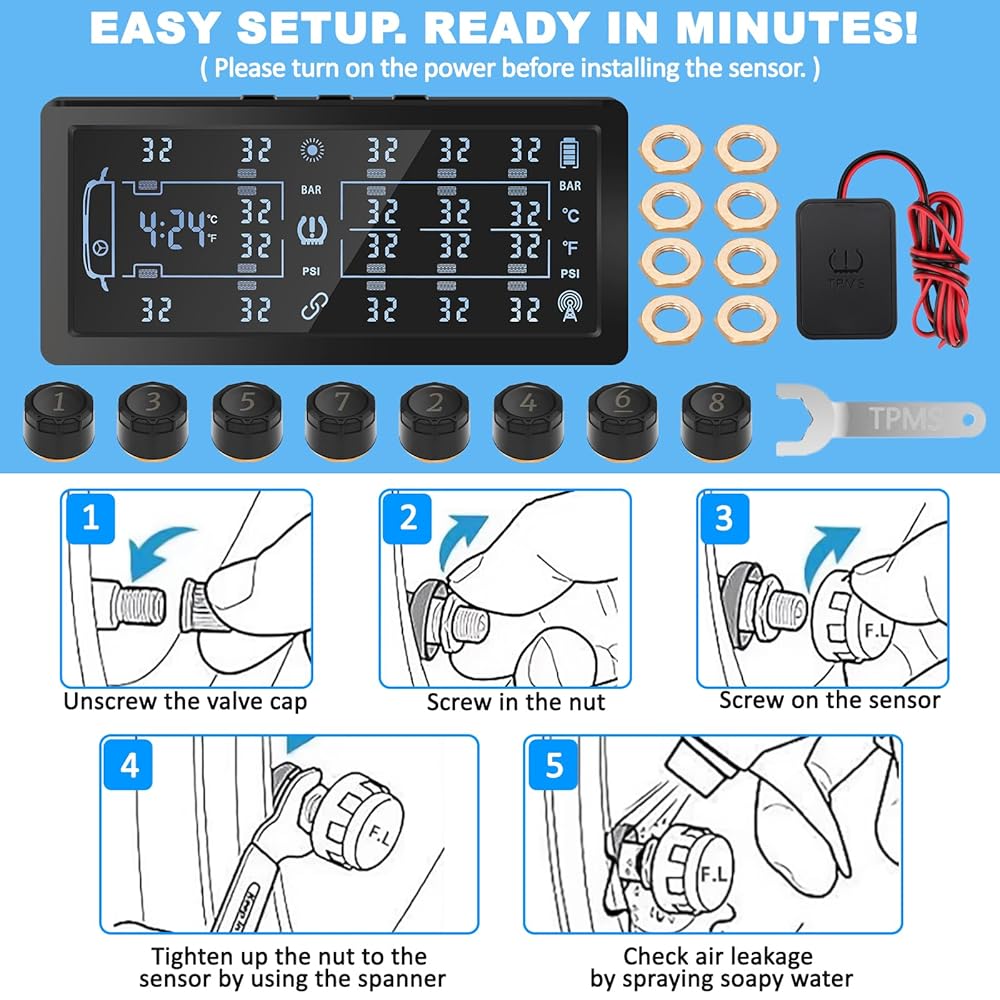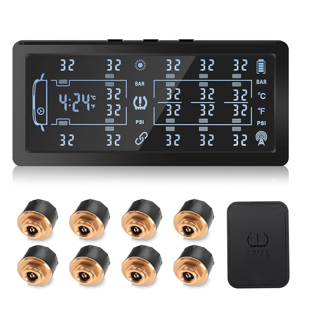 CUSTOMIZED 4/6/8-WHEEL MONITORING MODE : Taking into account the needs of users in actual use, our newly upgraded tire pressure monitoring system is designed with 4 or 6 or 8 tire switching option, which can be used on multiple vehicle models. If you have a travel trailer, our tpms 4/6/8 tire switching mode will be much more convenient for you. The front vehicle uses 4-wheel monitoring mode, and when using a trailer, it is set to 6-wheel or 8-wheel monitoring mode