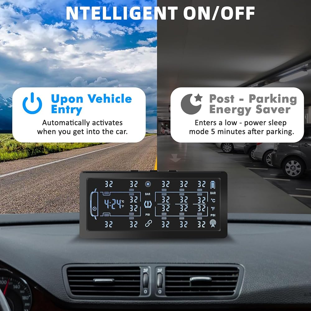 7 INCH LCD LARGE SCREEN & AUTO BACKLIGHT & SLEEP & AWAKE MODE: Our trailer tire pressure monitoring system has7 inch HD digital LCD screen, supports auto backlight, it can automatically adjusts brightness based on ambient light conditions. TPMS system can real-time full display the 8 tires tire pressure and temperature in low or strong light environment., enables you to focus on long-distance travel or freight. It will enter the sleep energy-saving mode after the vehicle stops running for 10 minutes, and will automatically wake up when the car is turned on. Tire pressure data continues to be monitored even in sleep mode, allowing you to easily check real-time tire status while stationary