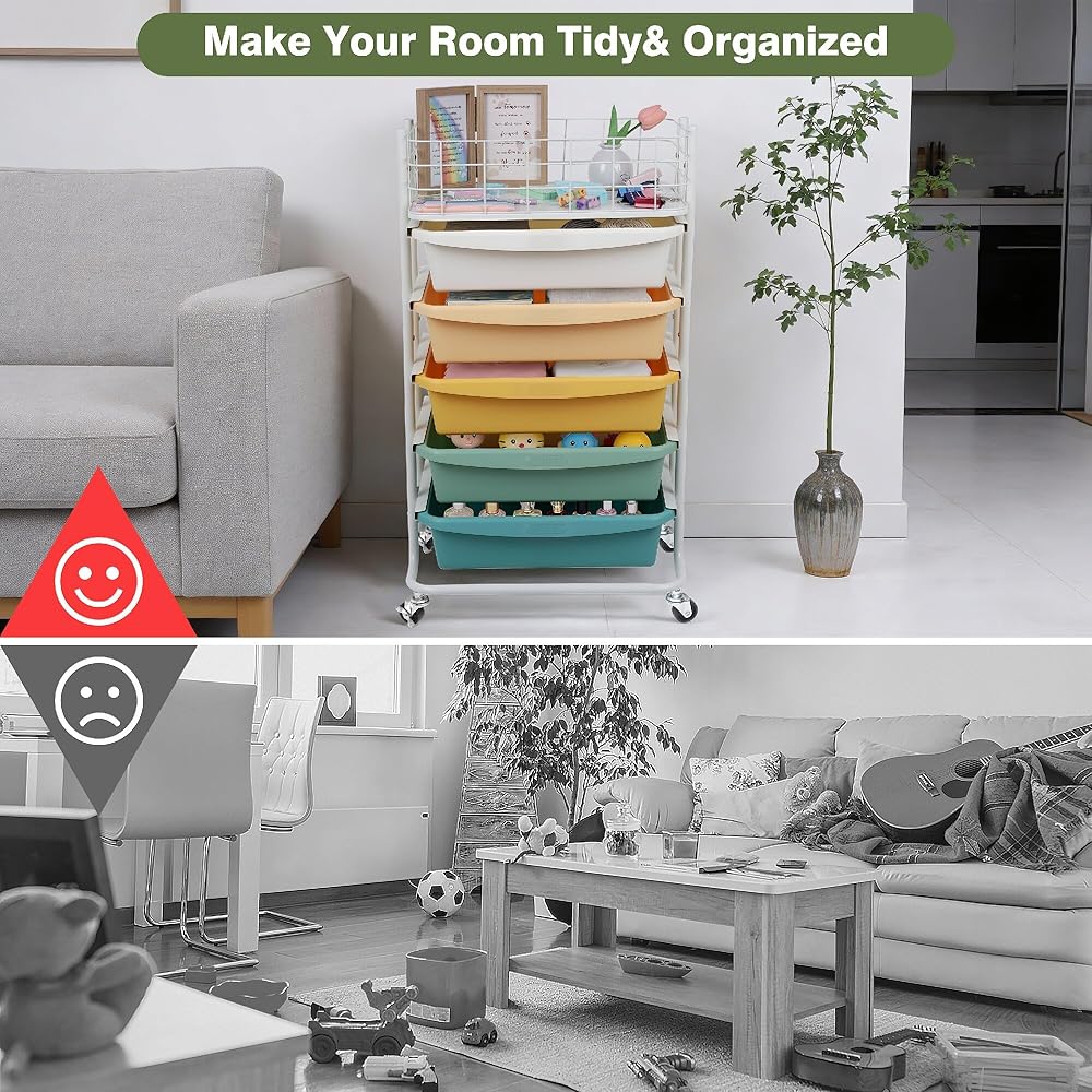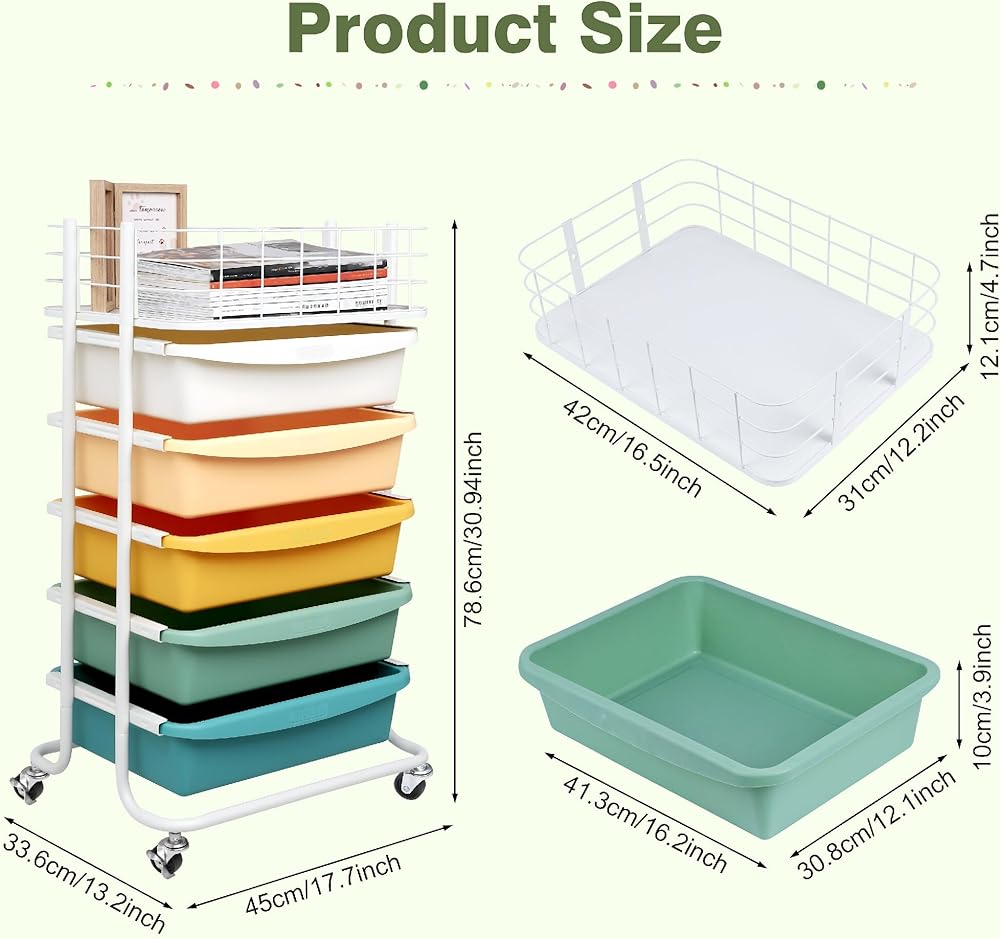 Versatile Organization: The storage cart comes with five spacious drawers (12.1" H × 16.2" W × 3.9" D) and a top frame (4.7" H × 16.5" W × 12.2" D). You can use drawers in different colors for storing and categorizing your items, helping keep everything neat and tidy.