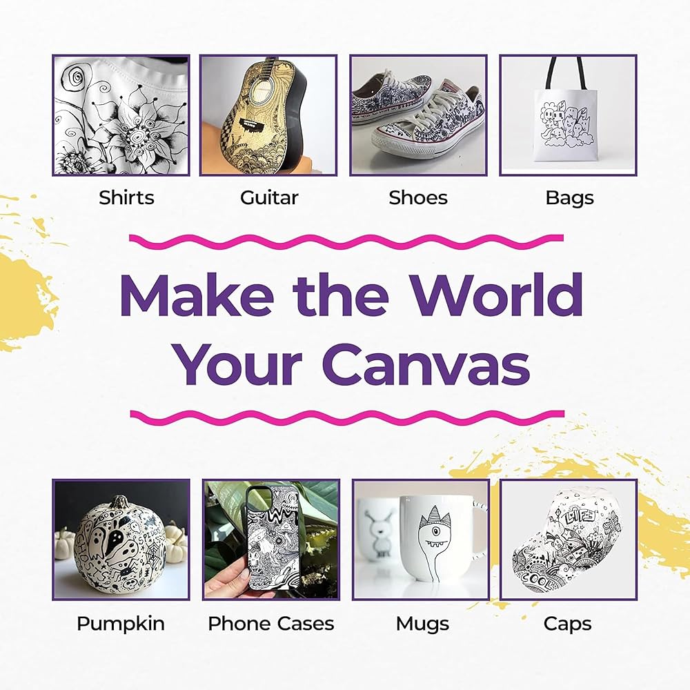 Unleash Your Talent: Embrace artistry with this black fabric pen and white paint pen. These markers for acrylic board are quick-drying and easy to use - shake, press, and let your inspiration guide you!