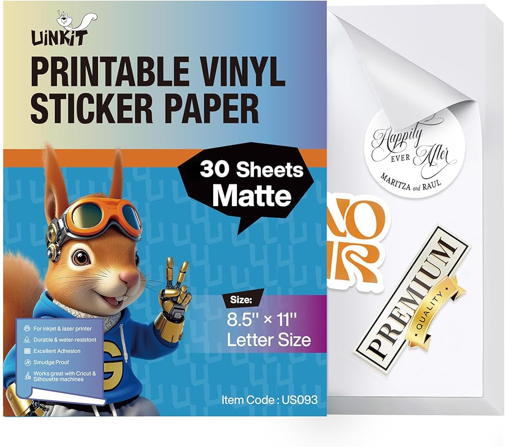 Uinkit 30 Sheets Premium 3mil Printable Vinyl Sticker Paper Durability Adhesive Paper 8.5 x 11,