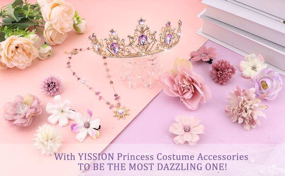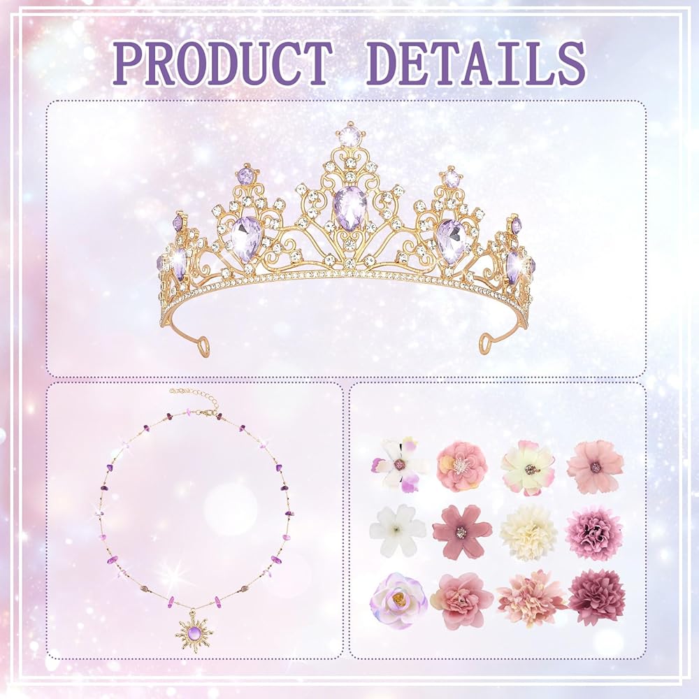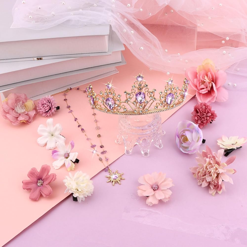 Complete Royal Cosplay Kit: Includes 1 shimmering gold tiara (adorned with purple acrylic crystals), 1 delicate sun-pendant necklace, and 12 artificial flower hair clips (various soft styles/colors) – all essentials for a full princess-inspired look