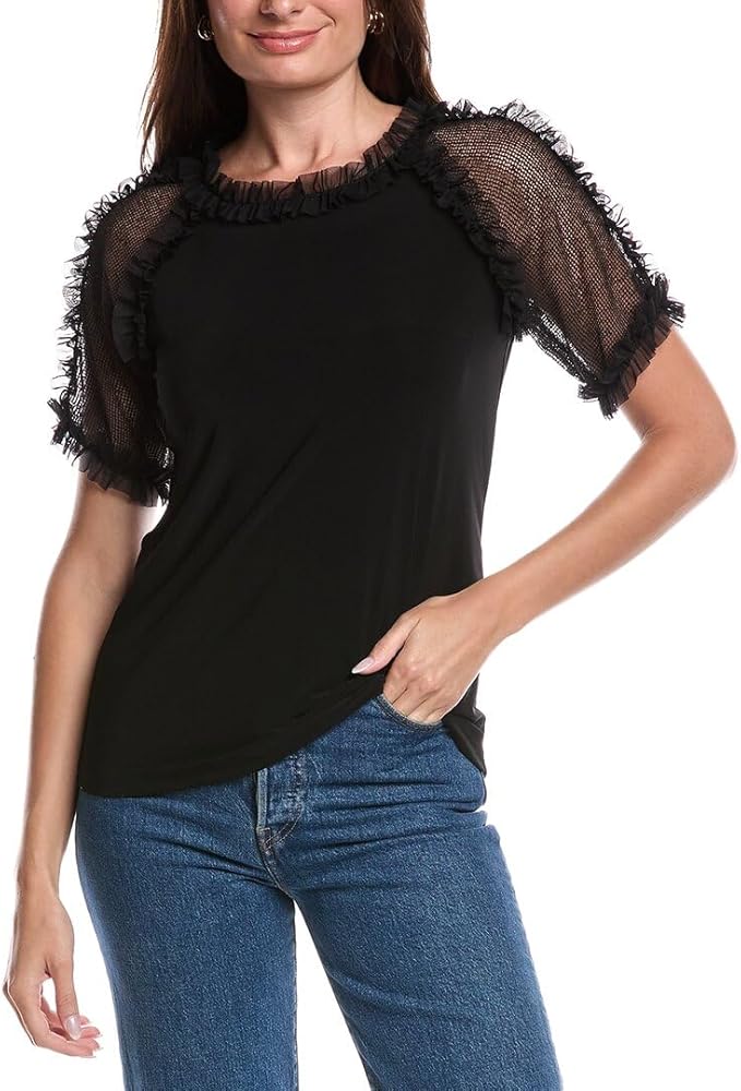 Design details: mesh sleeves, and lace ruffle trim