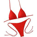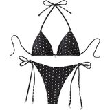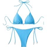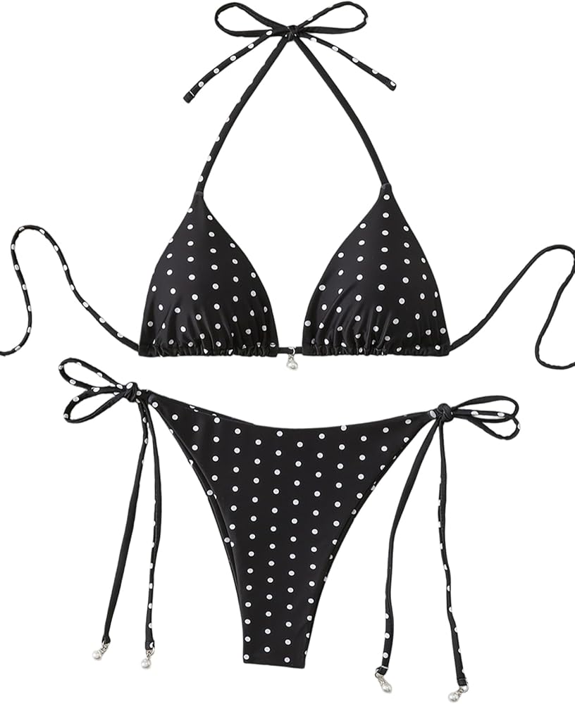 Design: The top features a classic triangle cup design with a halter neck tie that you can adjust for a customized fit and just the right amount of lift. The matching thong bottom has adjustable side ties, letting you control coverage to flatter your figure.