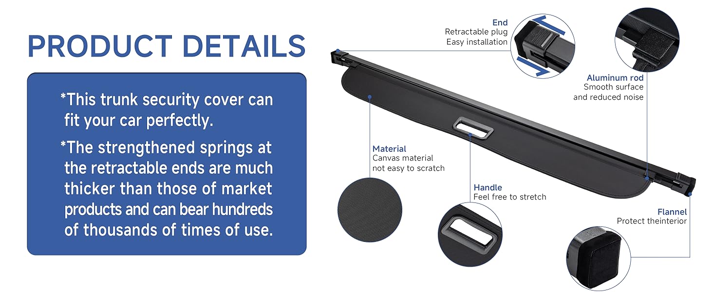[Space Utilisation] The trunk screen is retractable, included handle, when it is stowed away it takes up almost no space inside the trunk only, when opened, divide the trunk into upper and lower functional areas to provide more storage space and keep the trunk neat and orderly.