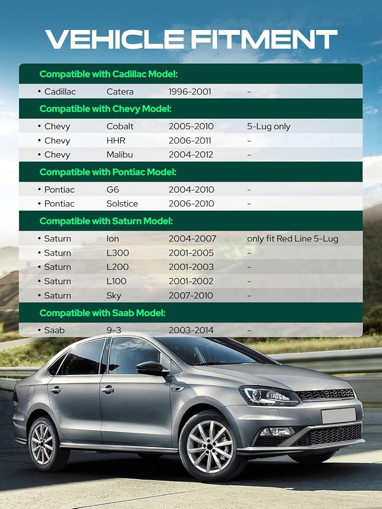 5x110 Vehicle Fitment: Compatible with Cadillac, Chevy, Pontiac, Saturn, Saab Models: 1996-2001 Catera, 2005-2010 Cobalt (5-Lug Only), 2006-2011 HHR, 2004-2012 Malibu, 2004-2010 G6, 2006-2010 Solstice, 2004-2007 Ion (Only fit Red Line 5-Lug only), 2001-2005 L300, 2001-2003 L200, 2001-2002 L100, 2007-2010 Sky, 2003-2014 9-3 (1998-2002 only fit 12x1.5)