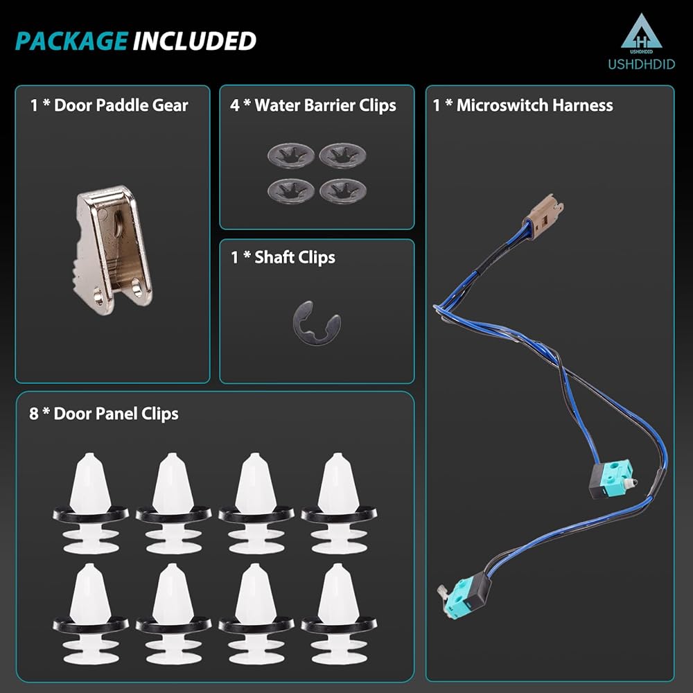 ✅Complete Rebuild Kit:Includes all parts for full repair: Microswitch Harness, Door Paddle Gear, Shaft Clips, Door Panel Clips, and installation hardware. No need to buy additional components