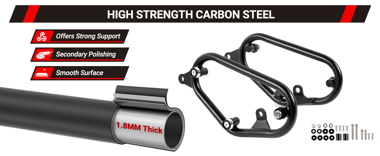 HEAVY-DUTY & DURABLE MATERIAL - The saddle bag mounting bracket is made of carbon steel with a high-temperature powder coating, offering exceptional durability, weatherproof, excellent anti-deformation performance, and enhanced surface protection via the heat-resistant coating for long-term motorcycle reliability.