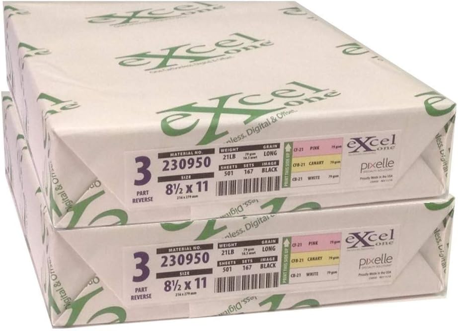 Excel One Carbonless 3-Part Reverse Paper (White/Canary/Pink), 8.5" x 11" (230950) - 167 Sets Per Ream -Two (2) Reams (334 Sets)