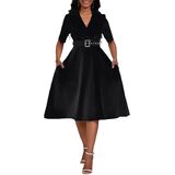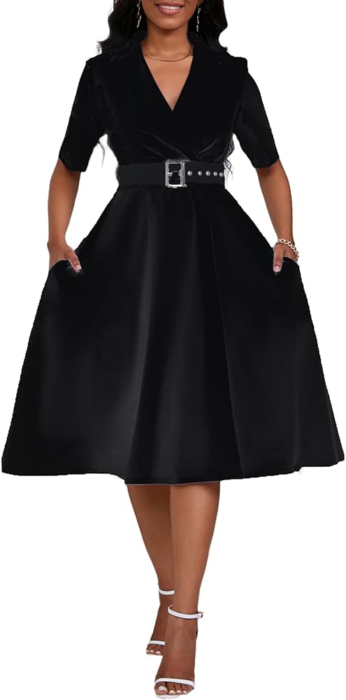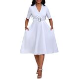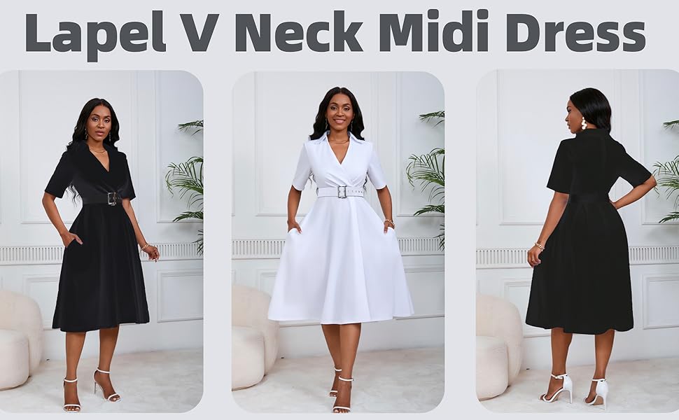 Women's Short Sleeve Midi Dress Elegant Lapel V Neck Office Dress Belted A Line Dress with Pockets