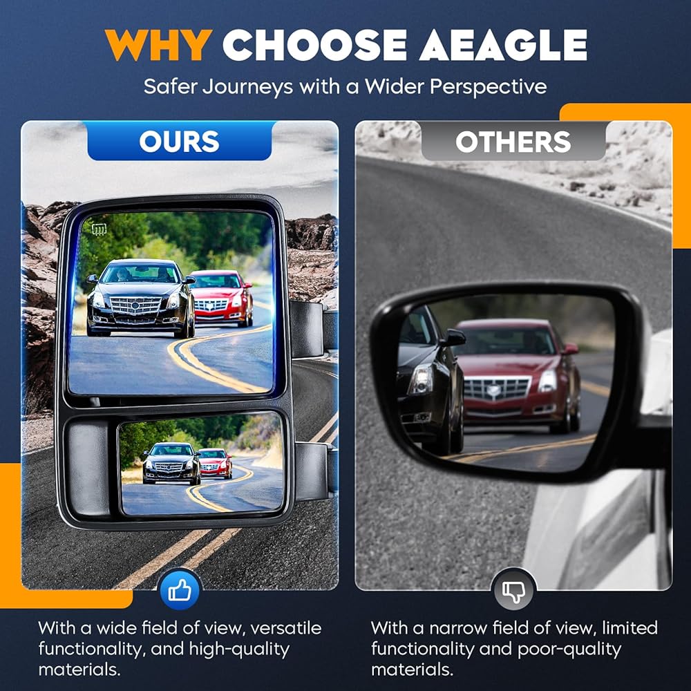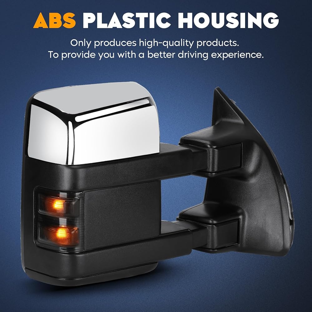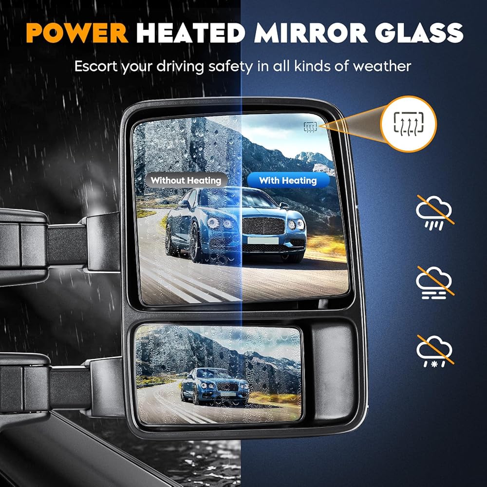 What Included: A Pair of Towing Mirrors (Including driver left side and passenger right side). These towing mirrors are made of high-quality glass and ABS material, which provide clear visibility even in bad weather to ensure your travel safety