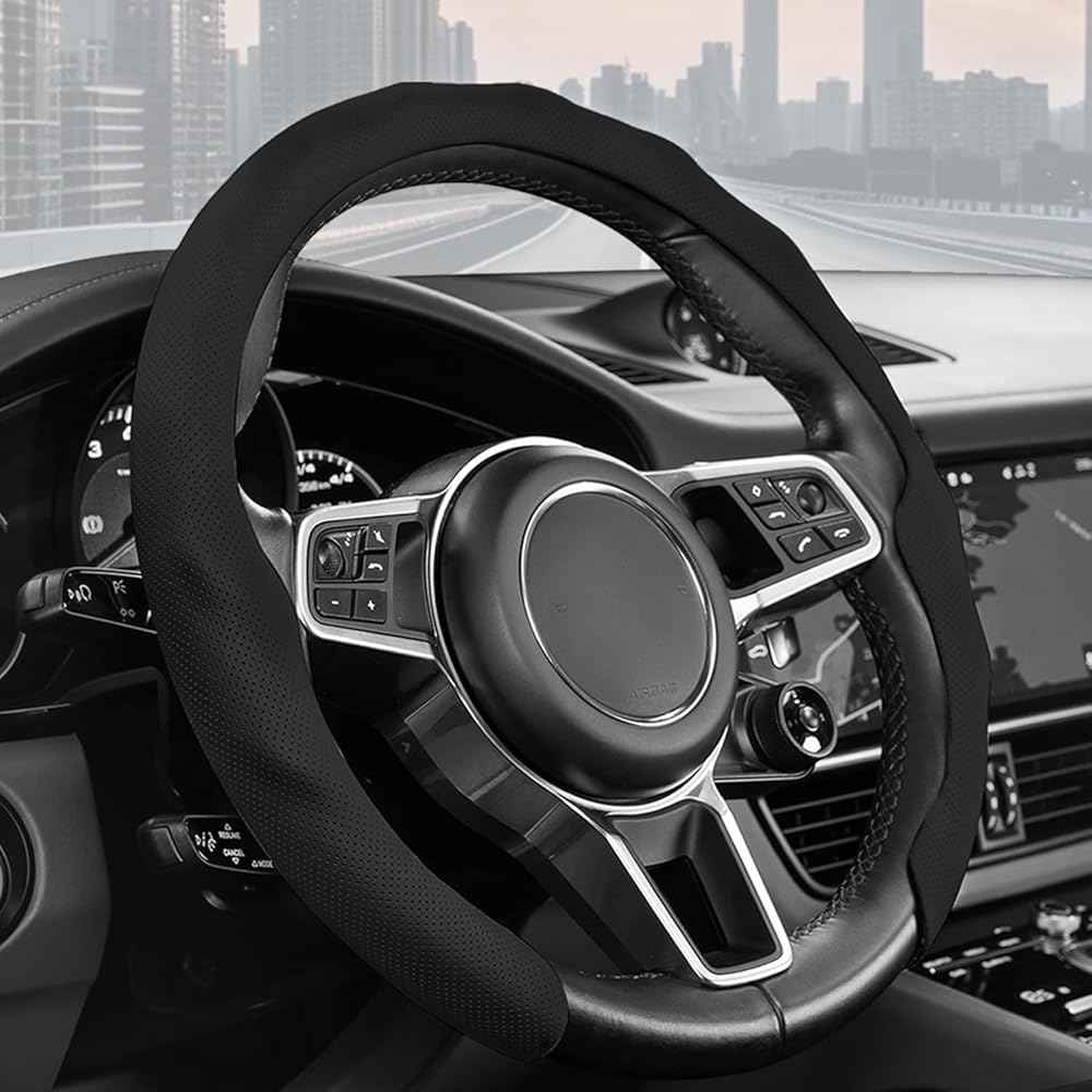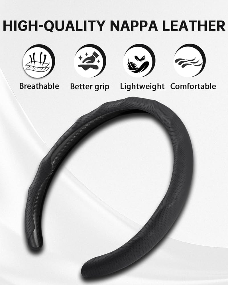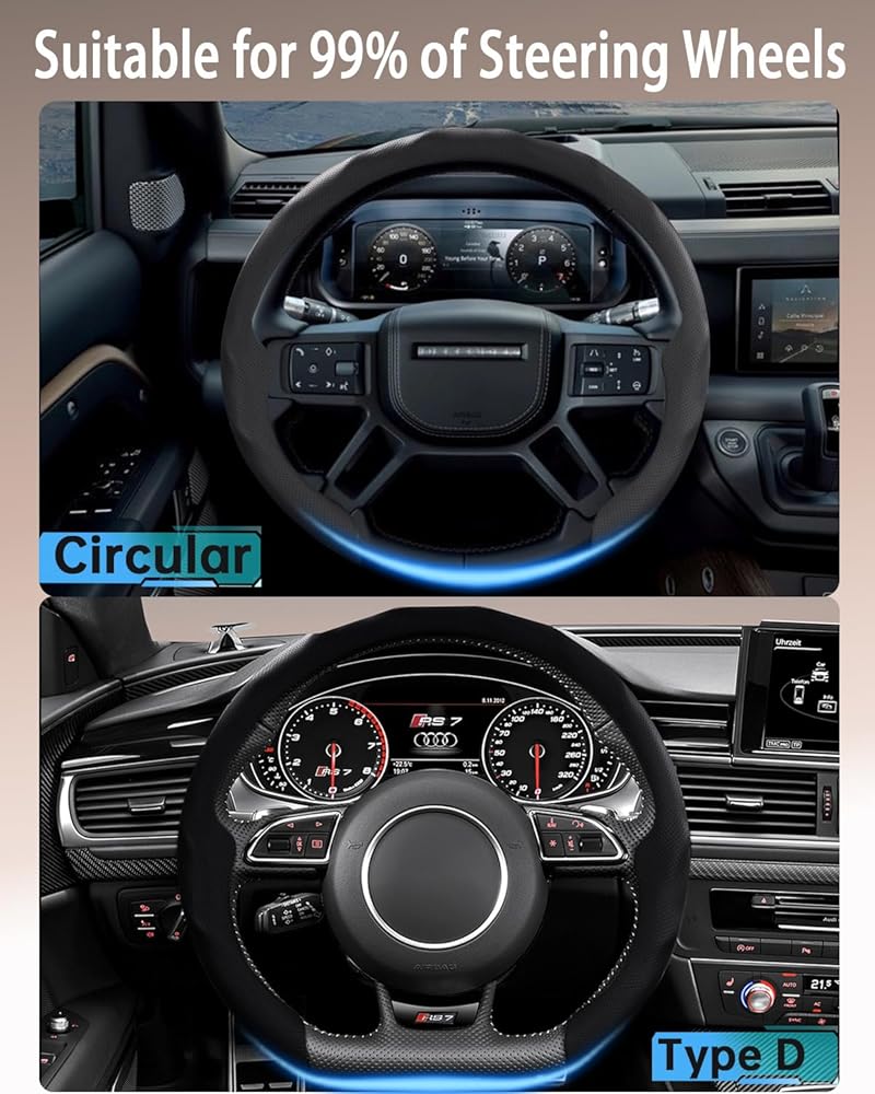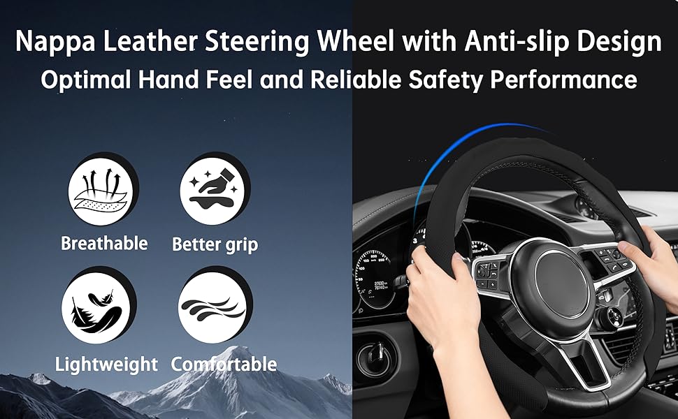 Leather steering wheel cover Anti-slip Comfort: Smooth and flexible texture that fully conforms to your palm for a comfortable, secure grip. Say goodbye to the icy feel of winter and the sticky discomfort of summer, ensuring a consistently comfortable and stable hold