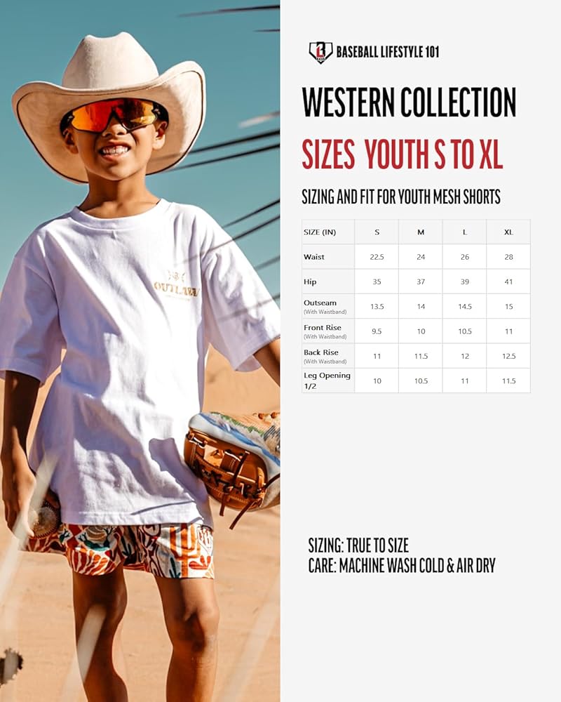 Boys mesh shorts for the players who do things their own way. Outlaw allover western print brings old west mentality to field work, strength training, and recovery days. When everyone else is clocking out you are still wrangling wins.