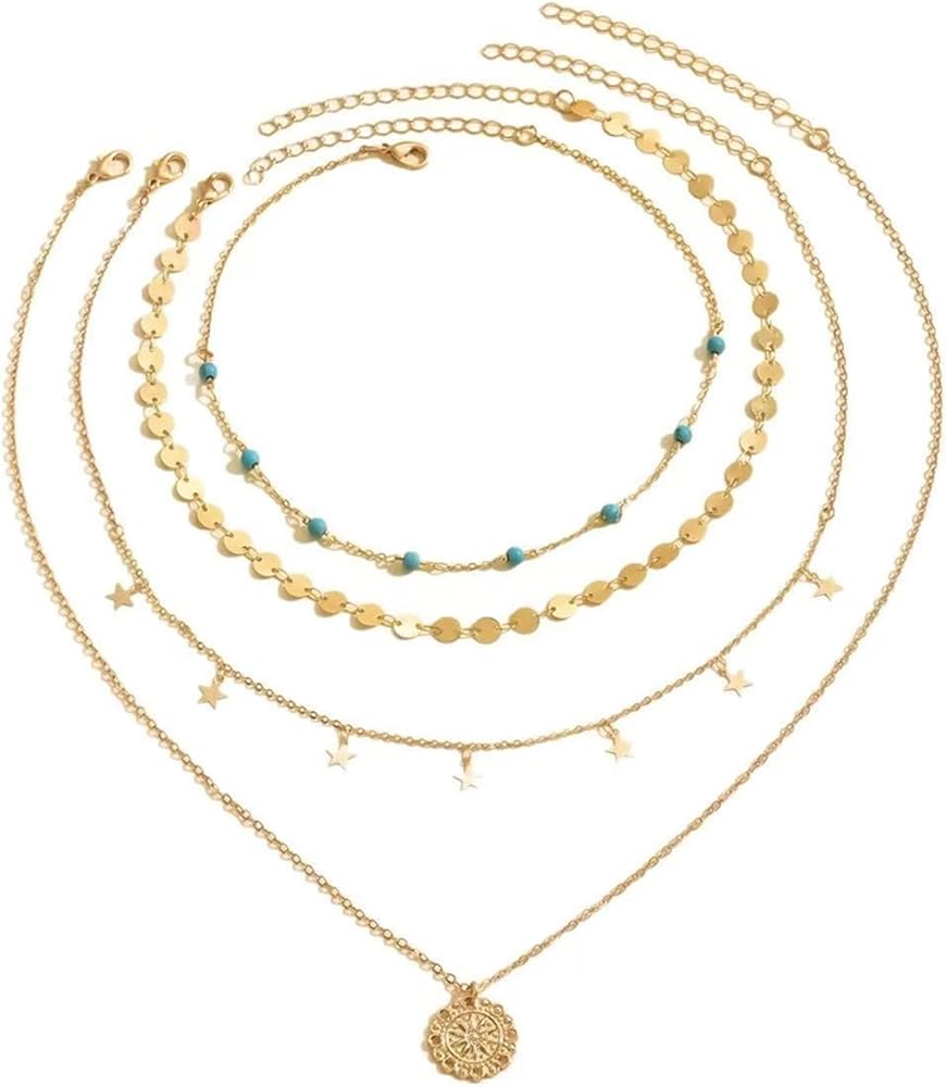 Embrace free-spirited style with this boho gold layered necklace set, combining a vintage western turquoise choker and simple round pendants for a relaxed, earthy look that's ideal as beach jewelry or festival wear