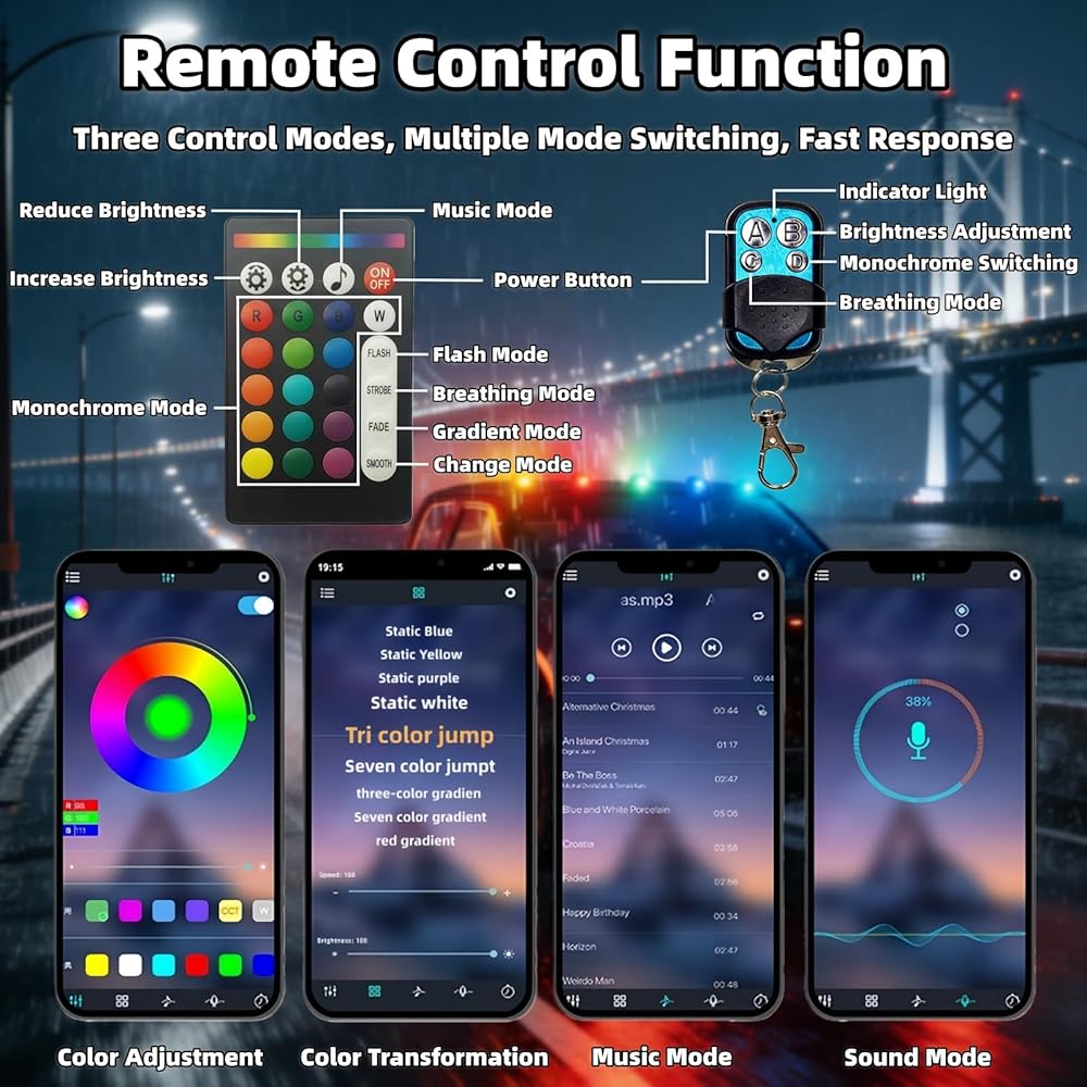 Dual Control Options: Comes with 2 remote controls (one keychain-style and one for the car) plus mobile APP control. Easily switch colors, adjust brightness, or select modes (Flashing/Breathing/Gradient/Changing) from the palm of your hand