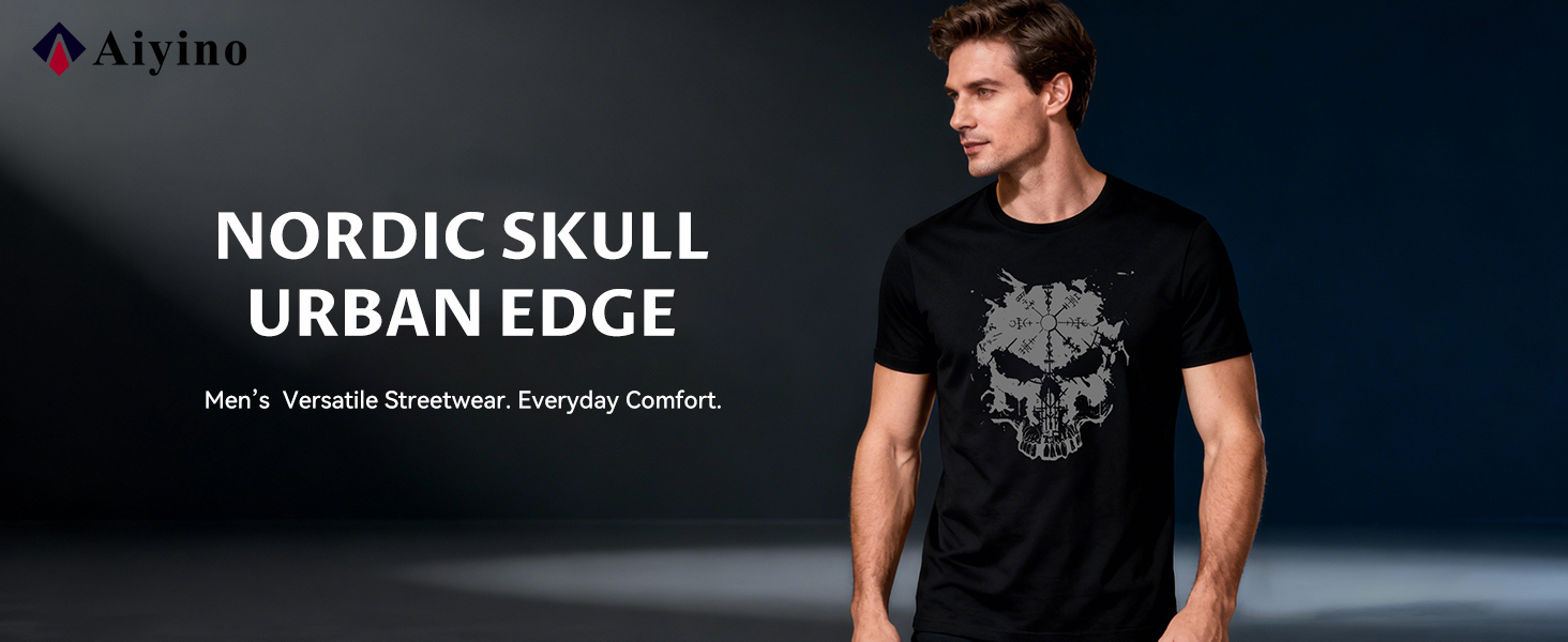 Viking Skull Graphic Design:This Viking skull t shirt for men blends Nordic-inspired skull elements with bold gothic style, creating a striking graphic look for modern casual streetwear.