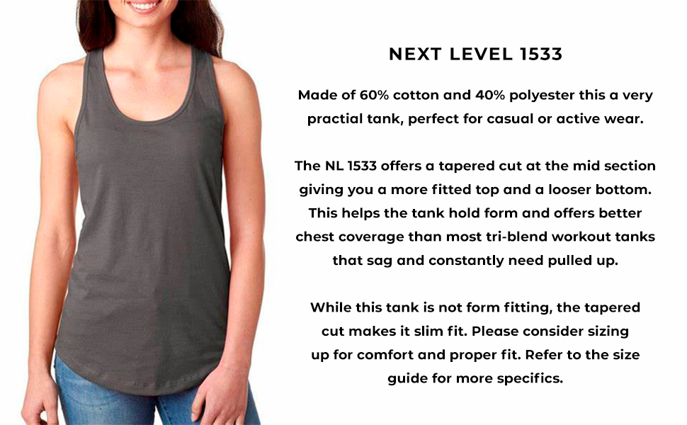 THIS TANK RUNS SMALL: While this tank is not form fitting, the tapered cut makes it slim fit. Please consider sizing up for comfort and proper fit. Refer to the size guide for more specifics. Thank you!