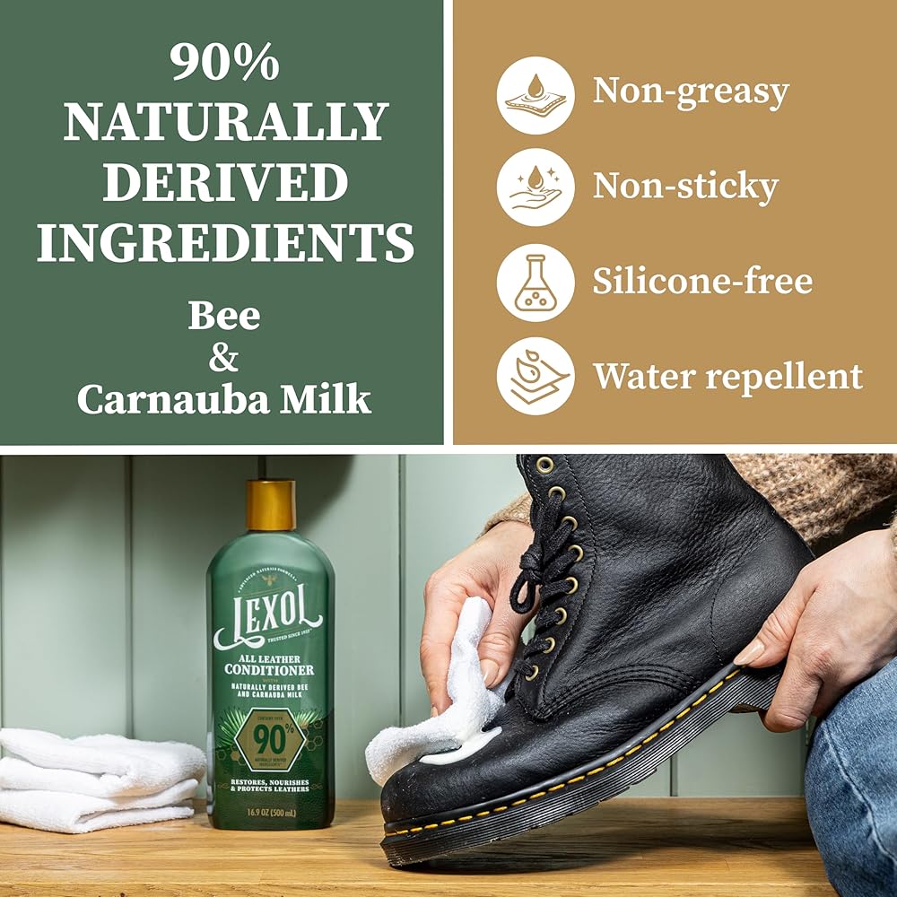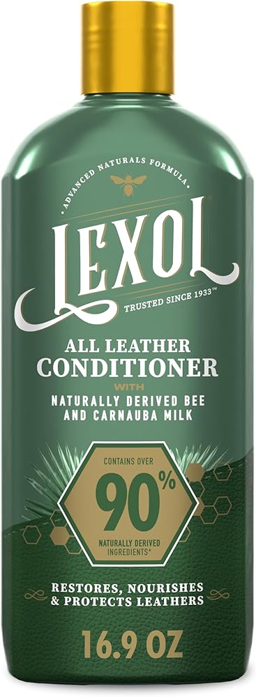 Nourish and preserve your leather with Lexol All Leather Conditioner, a professional-grade conditioning solution featuring 90% naturally sourced* Bee and Carnauba Milk. This advanced leather conditioner deeply nourishes, softens, prevents cracking and deepens color of all leather types without sticky residue or silicones. Perfect for both natural and synthetic leathers, this leather care product is ideal for car seats and interiors, boots, purses, bags, jackets, furniture, and more. The naturally derived formula maintains the integrity of your leather while restoring flexibility and natural shine to aged or neglected leather. Unlike synthetic conditioners, this silicone-free formulation provides professional-grade protection while supporting leather care. Simply apply with a soft cloth after cleaning with Lexol All Leather Cleaner for optimal results. Recommended usage every 6 months extends the life and appearance of your leather, keeping it soft, strong, and beautiful for years. Ideal for leather enthusiasts and car detailers who demand quality results, Lexol All Leather Conditioner delivers premium nourishment and protection in every application. *Using ISO 16128. ALLERGEN ALERT: Contains almond oil.