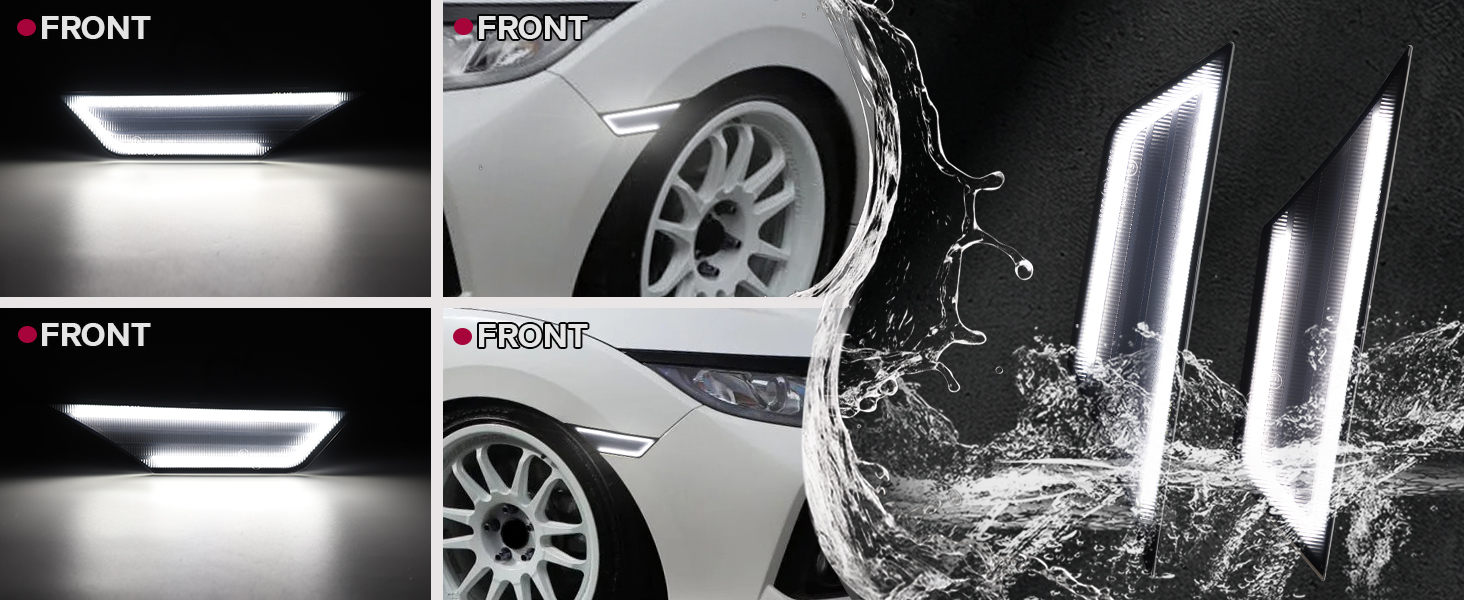 𝐃𝐮𝐫𝐚𝐛𝐢𝐥𝐢𝐭𝐲: Honda Civic side marker lights crafted from ABS housing and PC lens; Features anti-scratch & no faded even with long-time exposure on extreme weather; IP68 waterproof, DOT, SAE & CE certified resistant to heat and fading, ensuring long-lasting performance in various weather conditions.