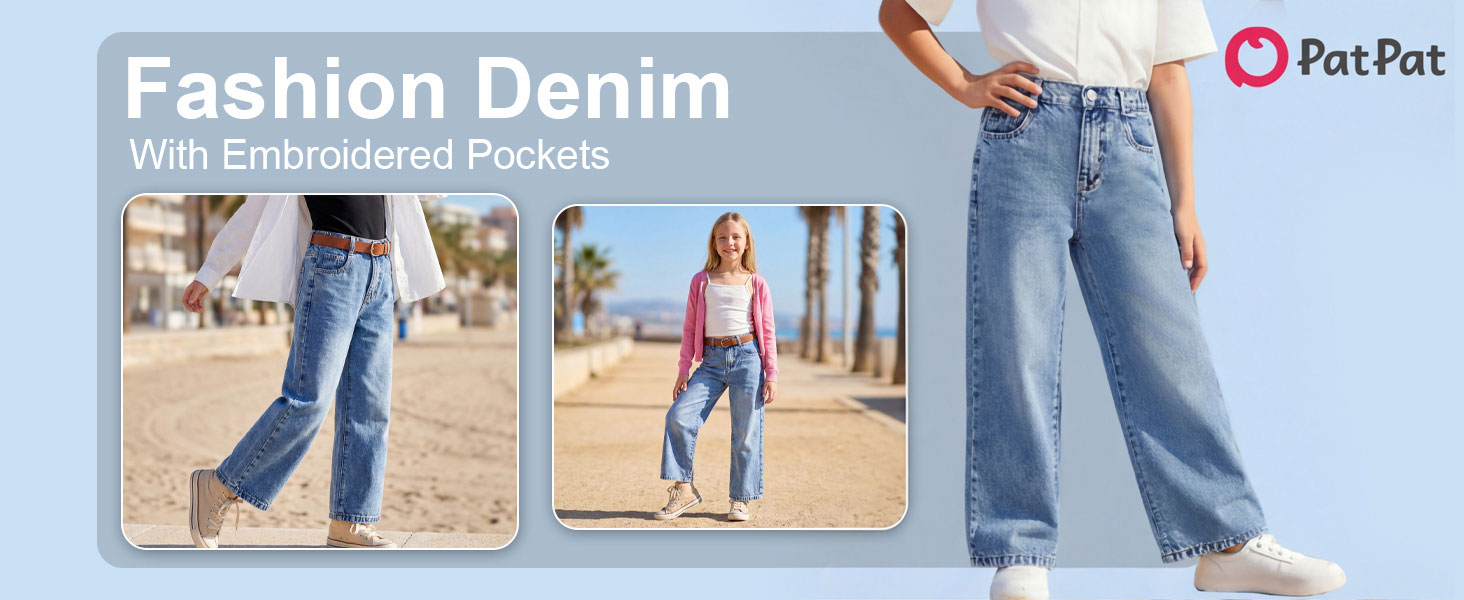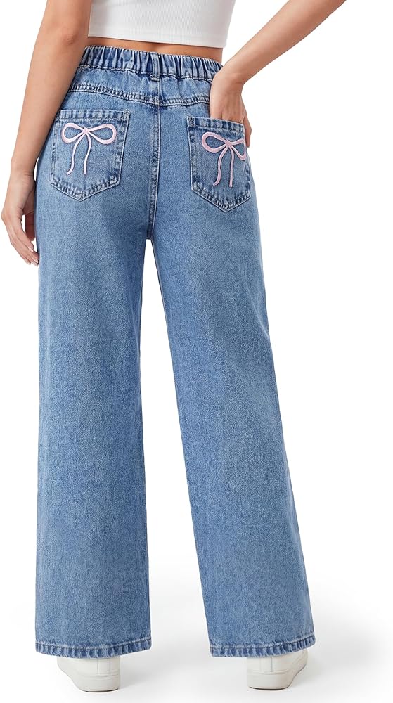 Features: These casual wide leg jeans feature an adorable bow embroidery design and a mid-rise elastic waist for adjustable comfort. They include a practical zipper fly and five classic pockets, offering both style and utility for girls aged 5-14 years.