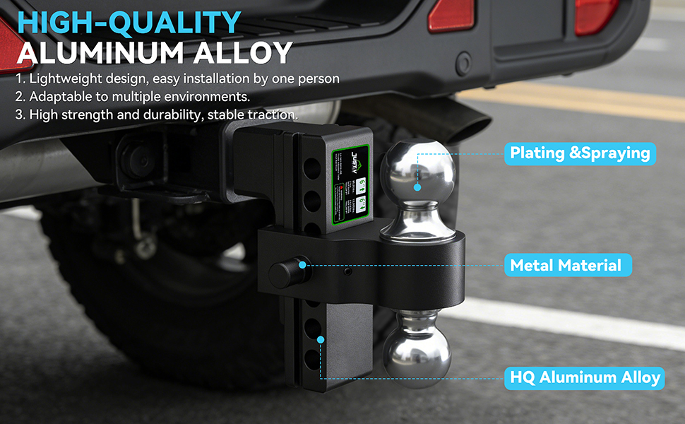 【Rust-Resistant & Durable Construction】The heavy duty trailer hitch made of aircraft-grade aluminum with premium powder coating – waterproof, rust-resistant, and able to withstand rain, snow, and harsh environment. Solid steel ball heads (heat-forged) prevent deformation, ensuring long-term use.