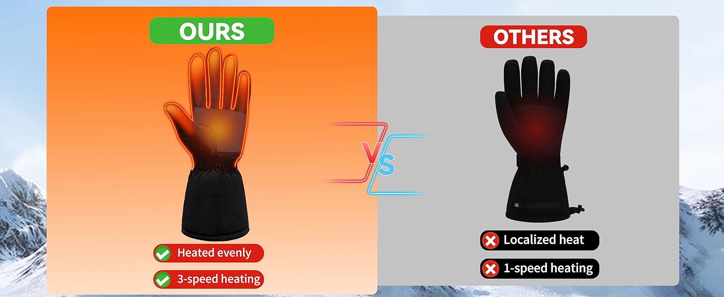 【Rapid Heating & 3-Level Control】 Features advanced carbon fiber heating elements that deliver warmth in under 30 seconds. Three adjustable temperature settings (High/Medium/Low) provide customized comfort for varying cold conditions, with focused heat on hand and fingers for maximum warmth.