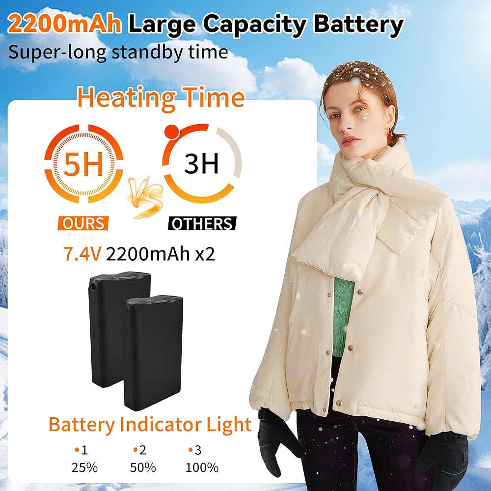 【Powerful Heating & Long-Lasting Battery】 Equipped with a high-performance built-in 7.4V 2200mAh rechargeable battery. The higher voltage delivers faster and more powerful heating. A single charge provides up to 2-5 hours of continuous warmth on the medium setting (actual runtime varies with ambient temperature and heat level), sufficient for all-day outdoor use.