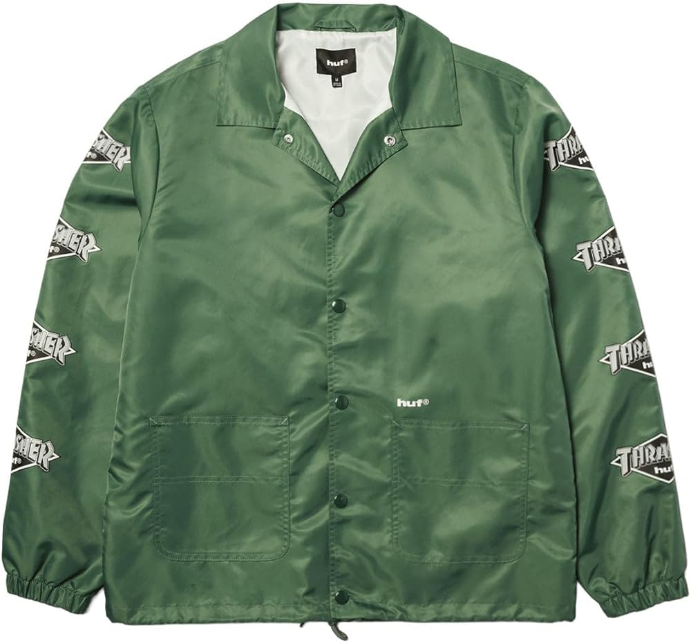 This HUF x Thrasher Logo Jacket, blending classic workwear and island-inspired design, features screen-printed details on sleeves and back, along with custom front patch pockets.