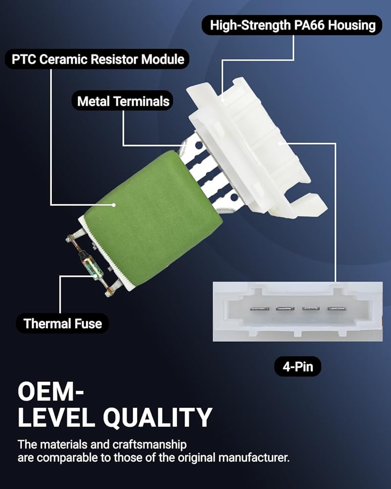 【OEM-LEVEL QUALITY】Designed to meet OEM specifications in fit and performance, this blower motor resistor features a high-temperature ceramic core for stable current control and reliable airflow regulation. An integrated thermal fuse provides built-in overheating protection for enhanced system safety. The base is molded from PA66-M40 glass-fiber reinforced material, ensuring excellent strength, vibration resistance, and long-lasting durability