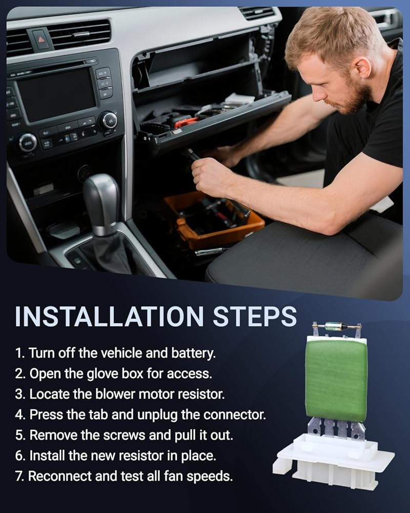 【EASY INSTALLATION】The resistor is located beneath the passenger-side dashboard and can be accessed by removing the lower trim panel. Simply disconnect the wiring harness and remove the mounting screws for a direct, no-modification replacement. Installation is quick and straightforward, allowing you to restore full HVAC blower functionality while saving time and repair costs