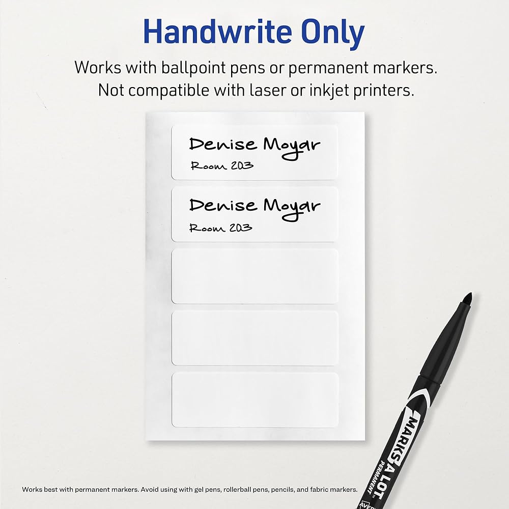 Make sure clothing and supplies always get returned to its rightful owner with 1" x 3" Avery 40725 No-Iron Fabric Labels. Just handwrite on the clothes labels with a permanent marker, peel and apply. The label's white background makes it easy to see the writing on your label for quick and effortless identification. You don't even have to worry about labels curling or falling off thanks to permanent adhesive that is guaranteed to stay in place. The no-iron clothing labels are flexible and durable enough to withstand multiple cycles in your washer and dryer. Not only do they make great name labels for clothing for hospitals, nursing homes, and restaurants, but their unique material allows you to apply the labels to other smooth surfaces. Use these labels on office and school supplies, water bottles, lunch boxes, storage bins, cups and bottles, camping gear, and more. Please Note: Handwrite-only and not compatible with printers.
