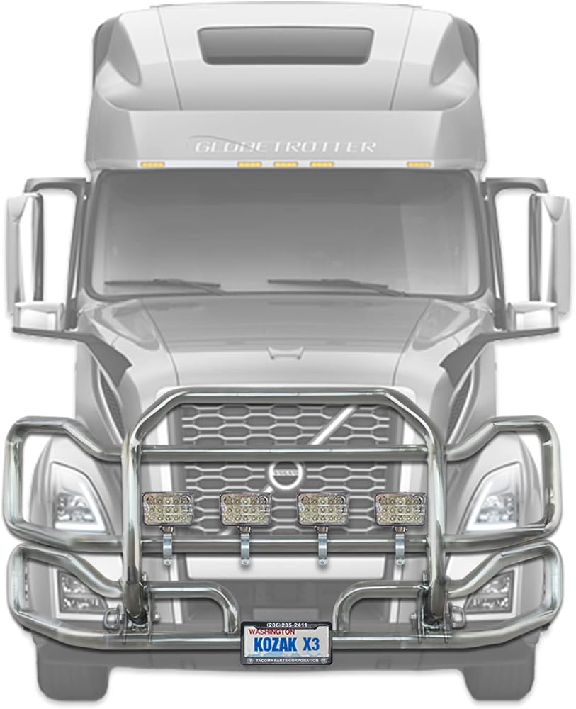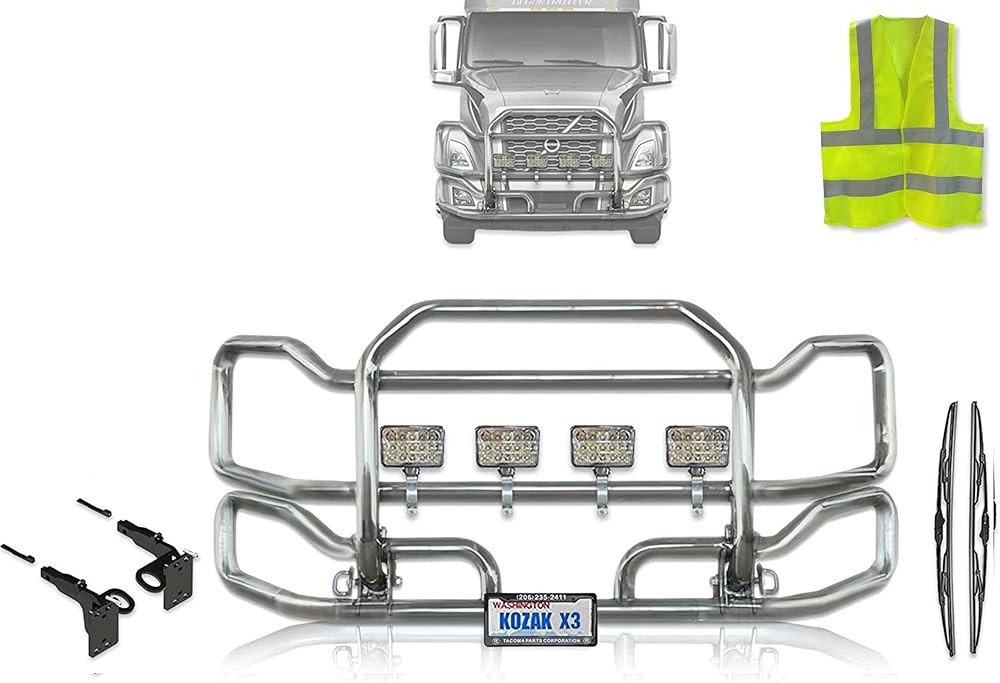 Front Grille Deer Moose Brush Bumper Guard Large Compatible with Volvo VNL 2018 and newer PLUS Bracket, Logo with Stripe, 4x 6" LED Headlights, Wipers, License Plate Holder and Frame, Vest