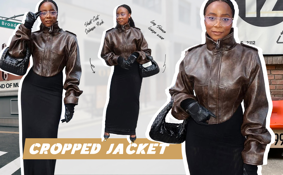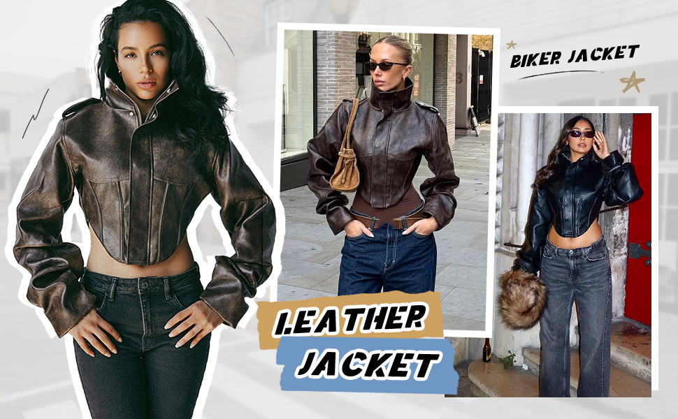 FEATURE: Women's leather Jacket, cropped jacket for women long sleeve, stand collar, lightweight, soft and comfy, causal fit, fall outfits, trendy jacket for women, cropped leather jacket for women, zipper jacket for women, faux leather jacket y2k coat, vintage jacket, club coat, bomber jacket, racer jacket, short coat, biker jacket, motor jacket, lounge wear, going out jacket for women, varsity jacket.