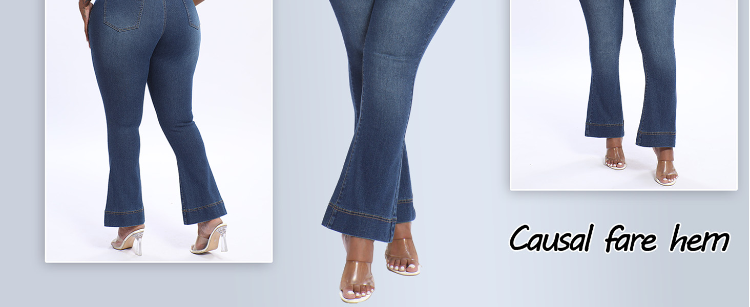 Sustainable Design: plus size flare jeans using sustainable wash and finishing techniques. Flare Trouser Jeans would fit your tights and butt,hug the waist very well. these jeans curve perfectly, stretchy and looks great.