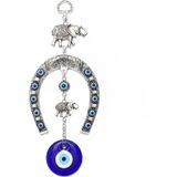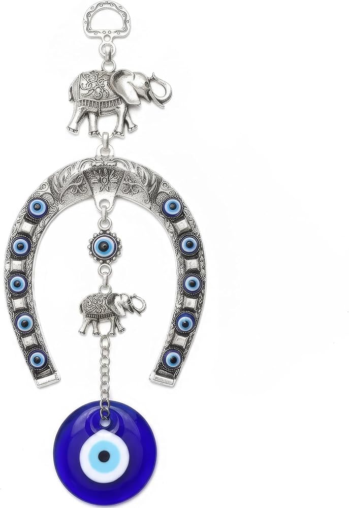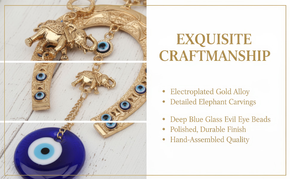ORNATE ARTISTRY: Features a detailed, gold-colored metal frame with intricate elephant figures. The vibrant blue glass of the Evil Eye provides a beautiful and striking contrast