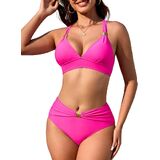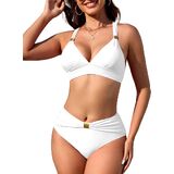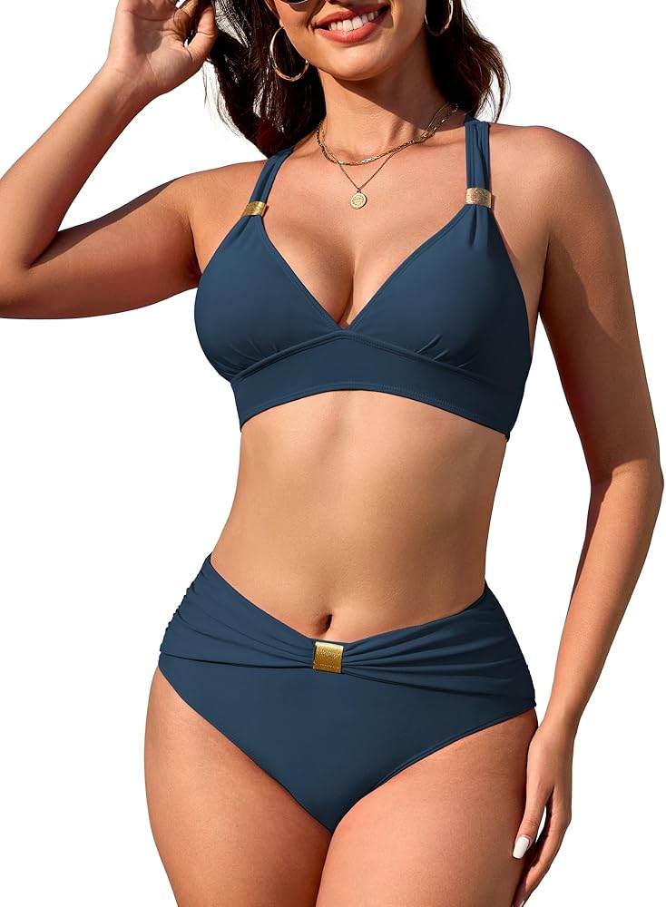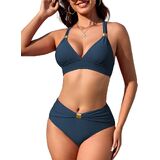 Style: Womens High Waisted Ruched Bikini Sets Triangle Top Two Piece Swimsuit Halter Metal Rings Bathing Suit.