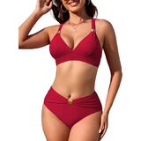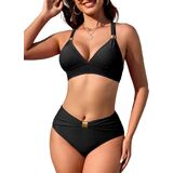 This women high waisted two piece bikini features gold metal ring for a flattering, ruched design adds sexiness.