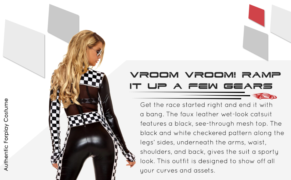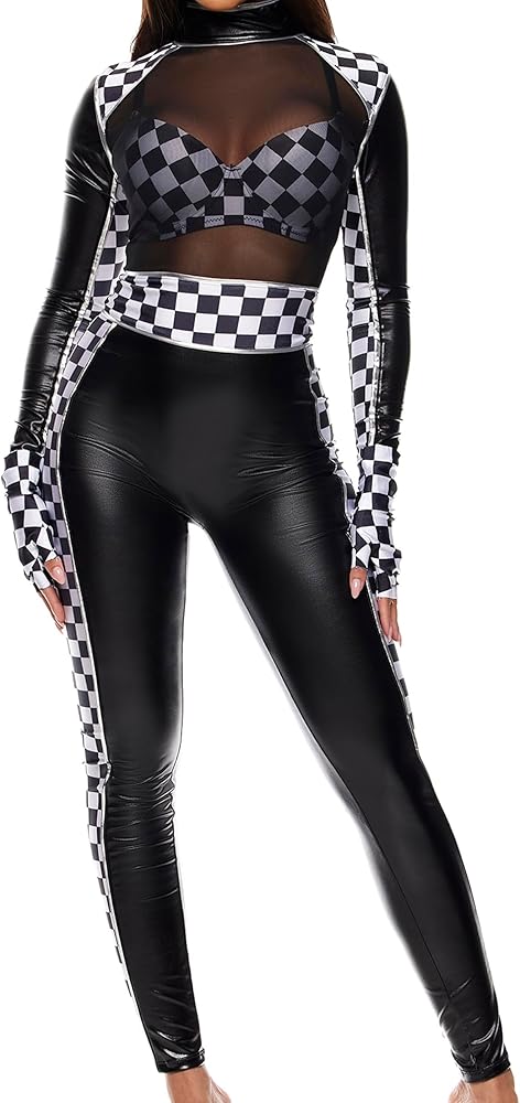 Sexy women's 3 piece. Metallic racer costume includes jumpsuit with checker print contrast, mesh insets, and aviator sunglasses with mirror lens.