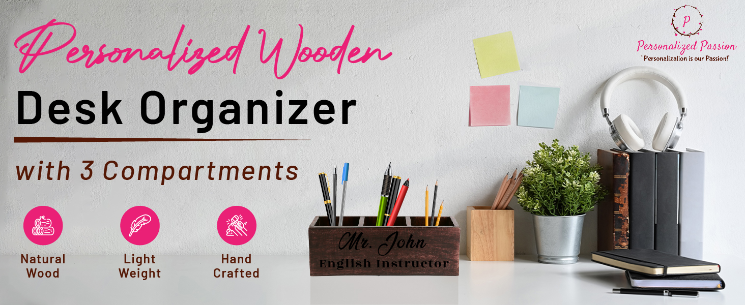 Organized & Tidy: Keep your desk neat and tidy with our personalized wooden pencil holder! With 3 compartments, it's easy to keep your items sorted and organized. Plus, the sleek design adds a touch of natural beauty to your workspace.