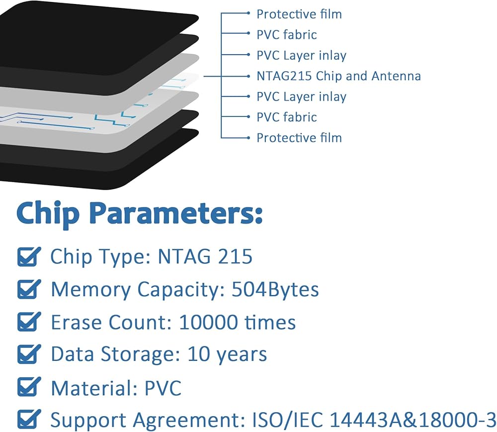 NTAG215 Chip: Features 504 bytes of usable memory, supporting up to 100,000 rewrites and 10-year retention. Store URLs, contact info, Wi-Fi settings, links, or app triggers. Fast, stable, and secure communication every time