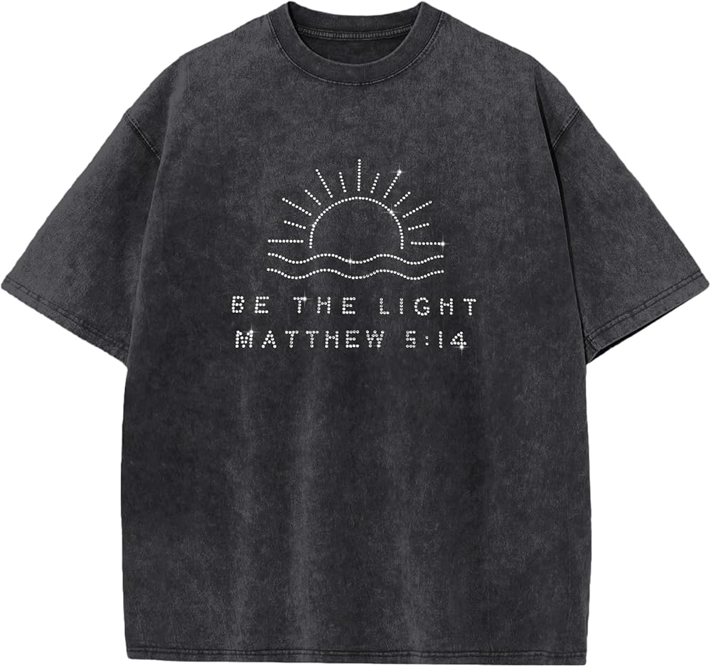Feature: Mens christian t shirts, jesus t shirts for men, religious faith shirt, be the light bible verse shirts, short sleeve rhinestone shirt, acid wash tshirt, mens graphic t-shirts, oversized tshirts for men