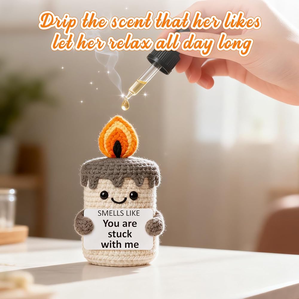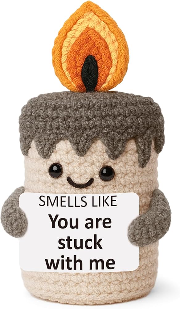 Funny Romantic Candle Gift: This handmade crochet candle features the humorous message “Smells like you are stuck with me”, turning love and commitment into a sweet inside joke. A funny yet affectionate romantic gift for women and men who enjoy playful humor and genuine connection in their relationship