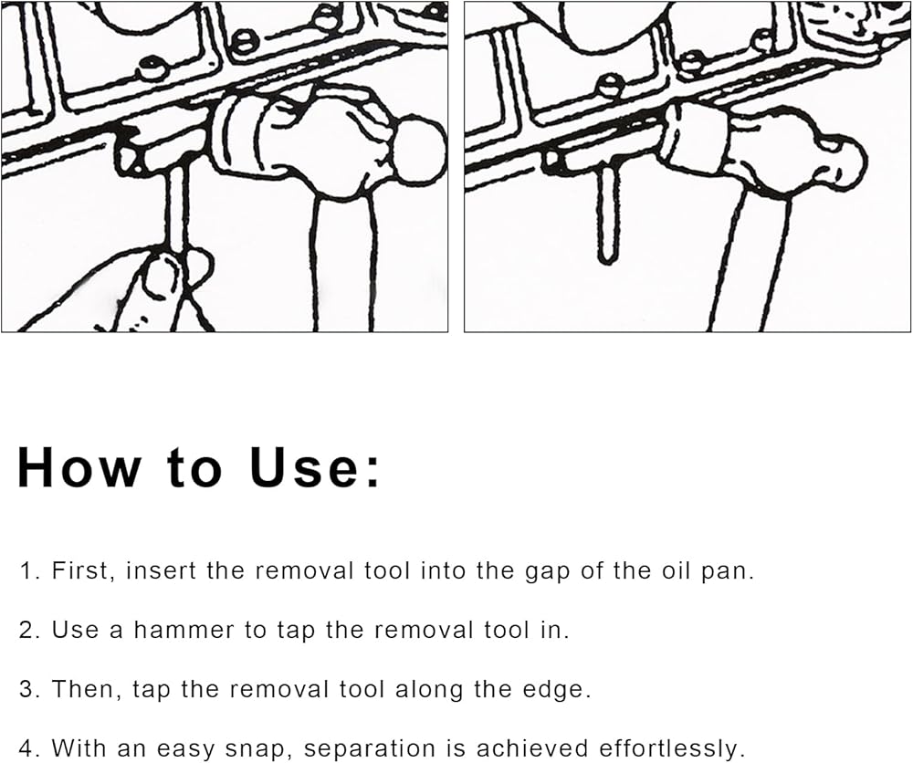 Easy to Operate: You just need to tap the back of the remover tool with a hammer to insert its cutting head into the tight fit of the oil pan. Next, you continue to use the hammer to hit the side of the tool and push the tool forward to complete the sealant removal